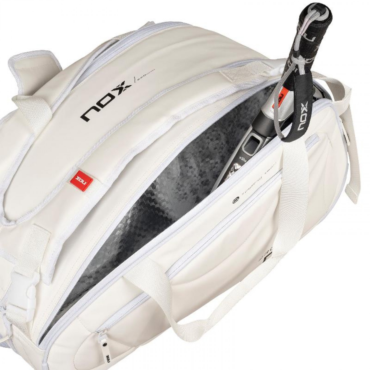 Progettata con il caratteristico stile classico di NOX e rifinita in un attraente colore bianco, questa borsa per racchette da padel offre una soluzione completa per trasportare tutto il necessario alle tue partite e tornei, combinando estetica e praticita in ogni dettaglio.